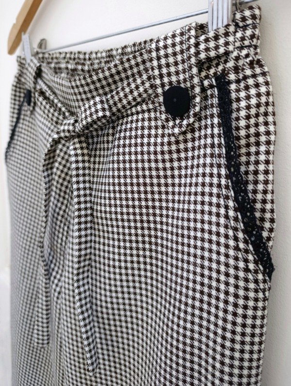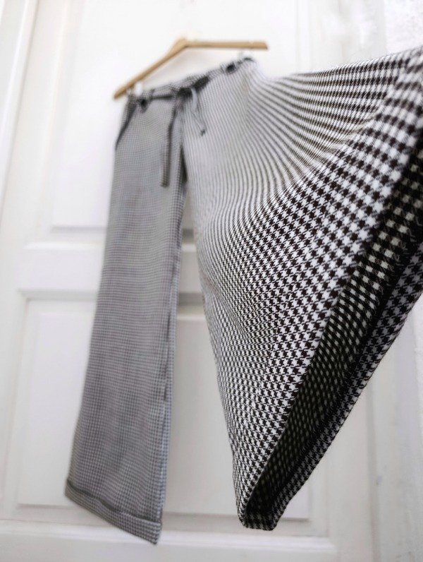 Este pantalón tiene un corte tipo palazzo con un tiro medio/alto, tiene 4 bolsillos y botamanga como terminación. En la cintura delantera hay dos galones con botones forrados por donde pasa un lazo. La cintura trasera lleva elástico que hace que se adapte bien a diferentes tipos de cuerpos.