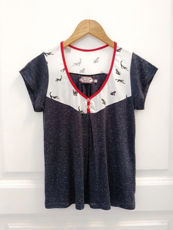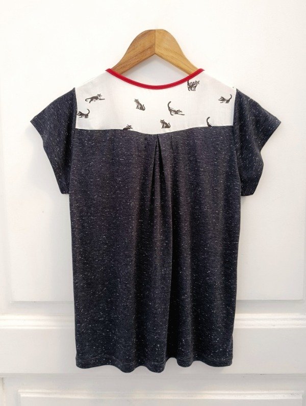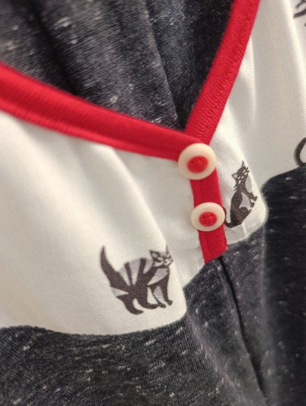 La base es de jersey gris topo jaspeado. El recorte delantero y el recorte de la espalda es de fibrana blanca estampada con gatitos.