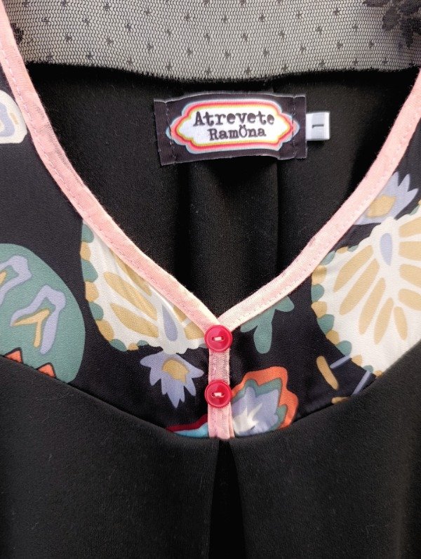 Detalle de vivo en el escote con dos botones cosidos a mano.