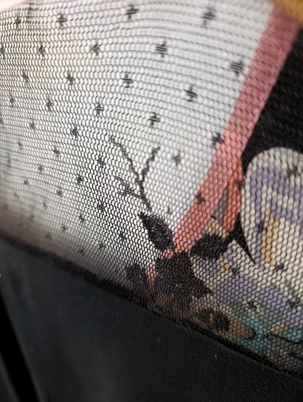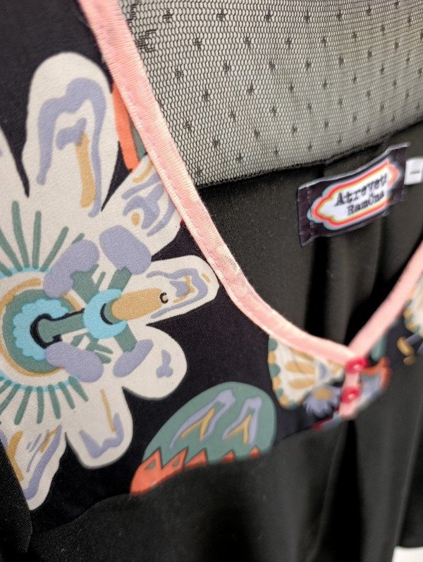 La base es de modal negro. El recorte delantero es una seda estampada con pasionarias y el recorte de la espalda es de encaje negro.